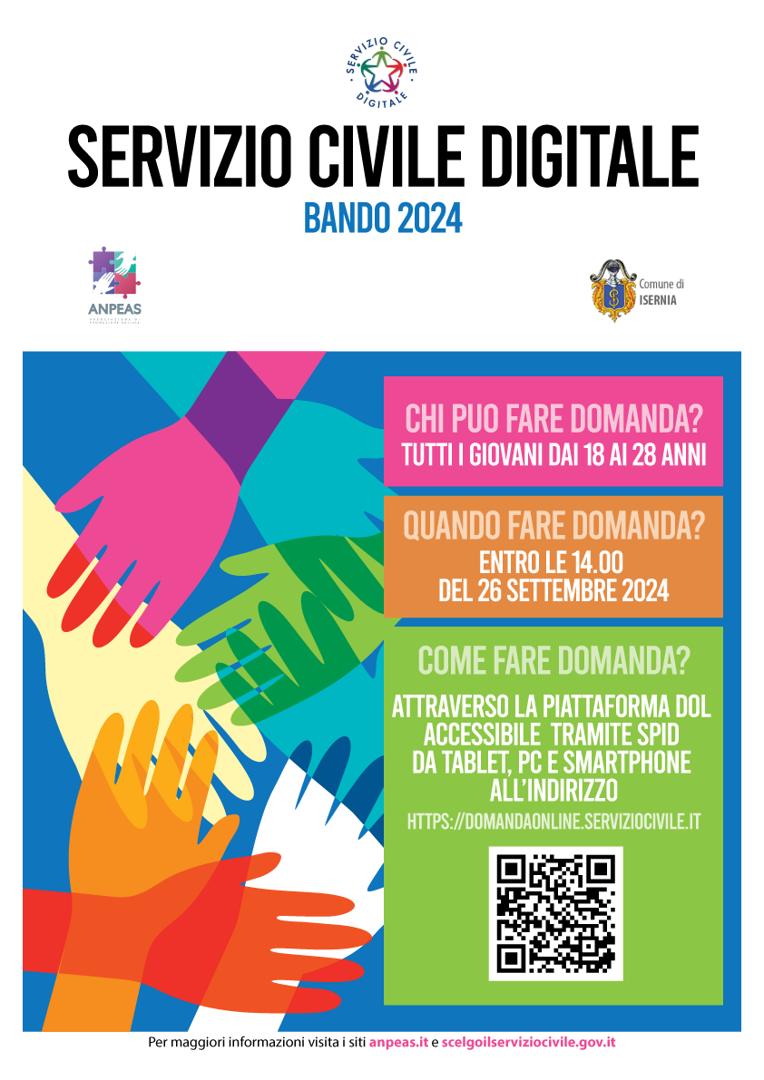 Si avvisa che è aperto il nuovo bando servizio civile digitale del 22-07-024. In allegato l'avviso dell'associazione ANPEAS.